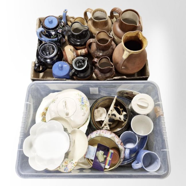 A group of stoneware jugs, pottery teapot, ceramics (two boxes)