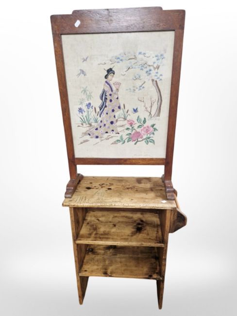 A rustic pine low shelf and an oak tapestry fire screen