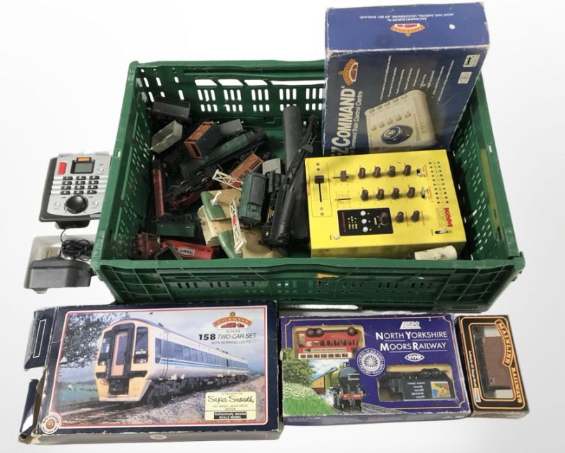 A quantity of rolling stock, Hornby digital control unit, Bachmann E-Z command train control center, in box, a further Bachmann two car DMU No. 31-500B, a Kam KFX two channel mixer, etc. (1 box)