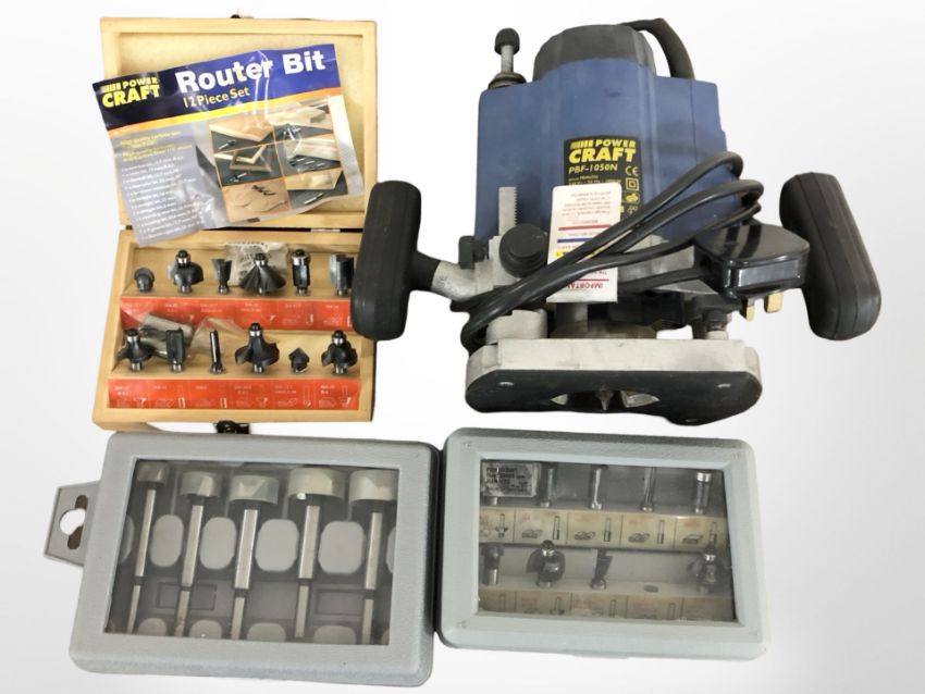 A Powercraft PBF-1050N router and three boxes of router bits. (1 box)