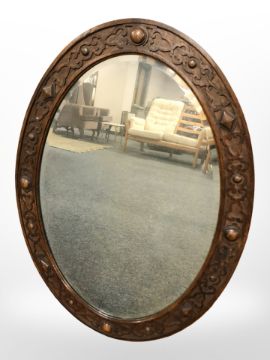 An Edwardian Arts & Crafts oval mirror, width 90cm
