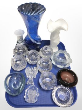 A group of Scandinavian glass wares including textured tea light holders, Art glass vases, paperweights etc