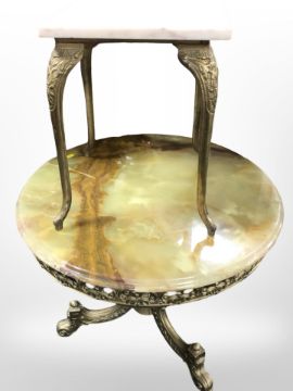 A cast brass and onyx circular occasional table, diameter 62cm, and a further marble topped table.