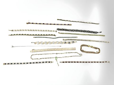 Fourteen various bracelets including a three-tone Italian silver herringbone link example, plus a necklace.