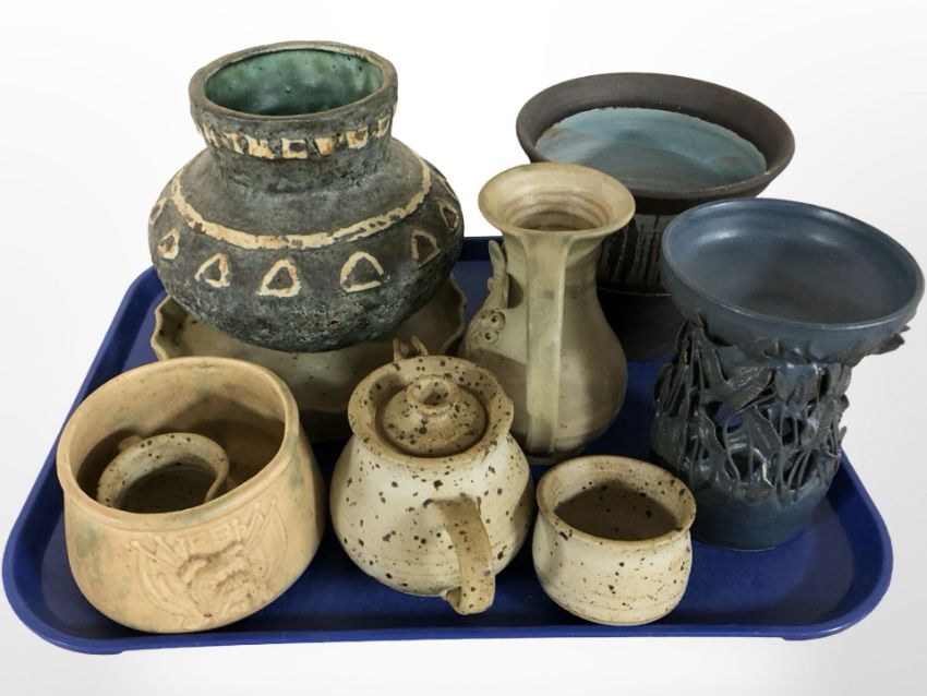 A group of studio pottery ceramics to include naturalistic pedestal dish, teapot etc