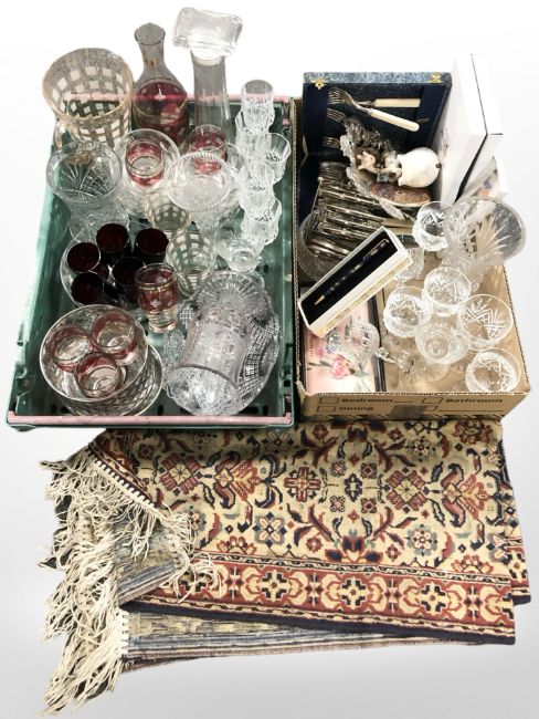 An Eastern wall hanging, silver plated ware, cutlery, drinking glasses, vases, etc (2 boxes)