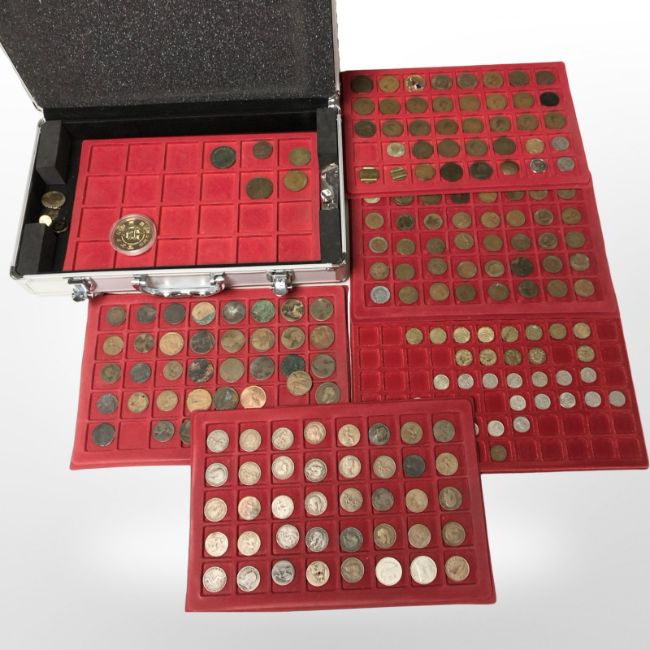 Three aluminium coin collectors cases with lift out trays, containing a large quantity of assorted 19th century and later world coins, Chinese examples, British pre-decimal coins, crowns, etc.