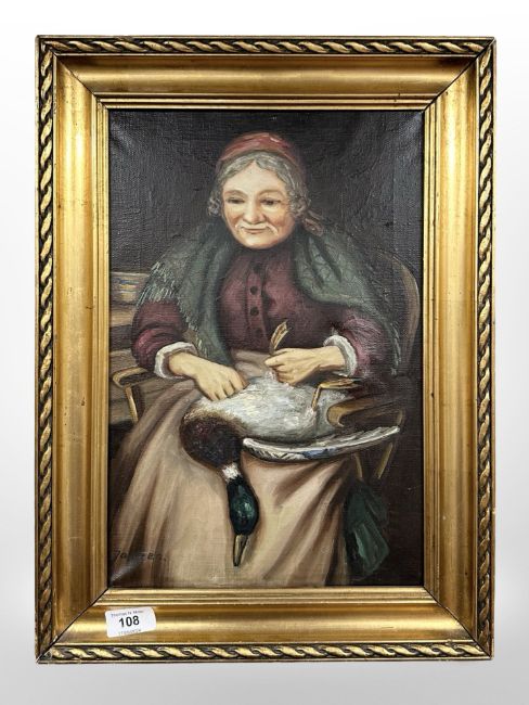 Danish School : Lady plucking a duck, oil on canvas, 25 cm x 37 cm.