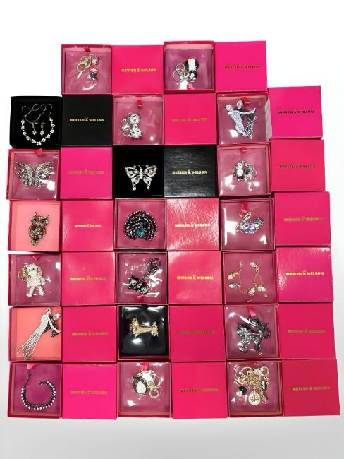 Twenty Butler & Wilson brooches, key chains, a necklace and earring suite etc, in boxes. (20)