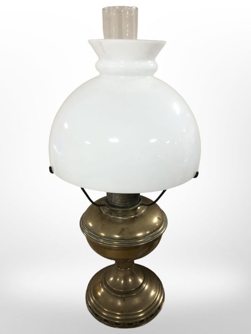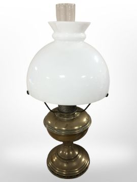 A brass oil lamp with opaque glass shade, height 52 cm.
