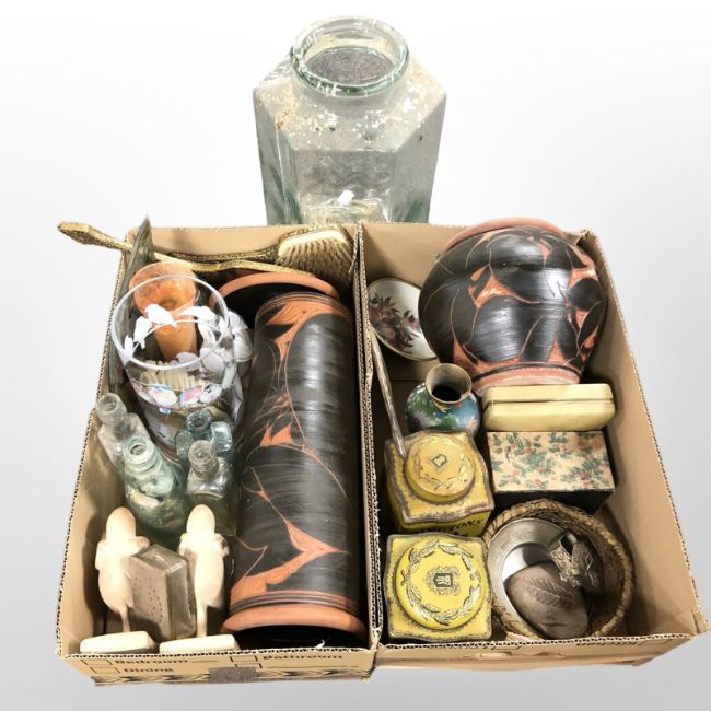 Two Ringtons tins, cloisonne vase, two terracotta vases, assorted bottles, glass ware and other glass etc (2 boxes)