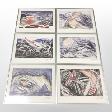 20th century continental school, six abstract colour lithographs, indistinctly signed and dated 1991, framed as a set, each 20 cm x 29 cm. (6)