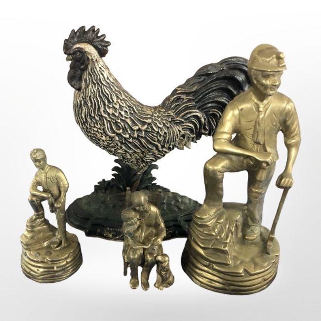 Two brass figures of miners, further figure and cast iron rooster door stop