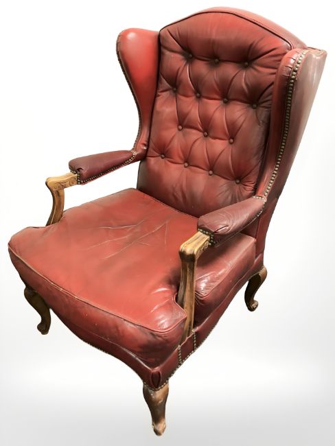 A beech framed Chesterfield-style wingback armchair in oxblood buttoned leather.
