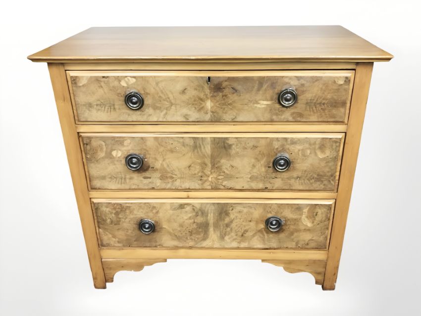 An Edwardian walnut three drawer chest, 91 cm x 49 cm x 82 cm