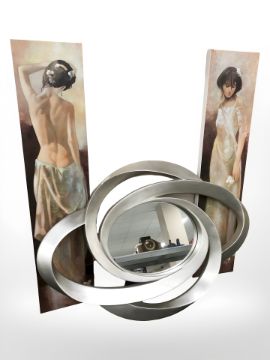 A contemporary silvered mirror, width 124 cm and two wall canvas