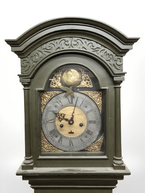 A continental painted long case clock with pendulum and weights, height 230 cm