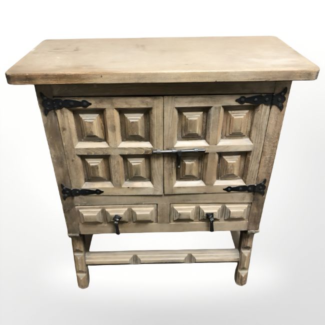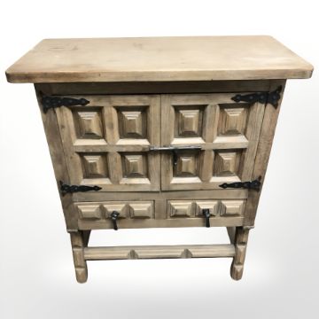 A reproduction beech double door cabinet with wrought iron mounts, 80 cm x 37 cm x 91 cm.