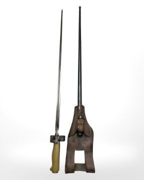 A French M 1886 / 93 / 16 Lebel Epee bayonet with brass hilt, steel scabbard and leather frog, blade 52 cm.
