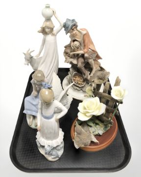 An Italian porcelain figure of a tramp and dog, Russel Willis Border Fine Arts figure of birds and three Nao figures.