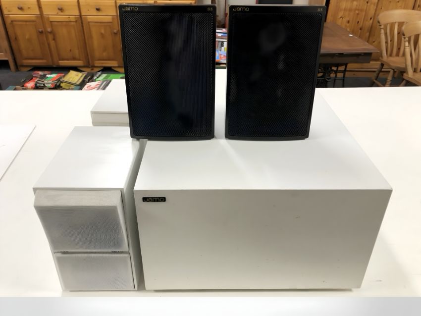 A Jamo speaker, further pair of Jamo S3 speakers and a pair of Bang & Olfusen CX50 speakers (no leads)