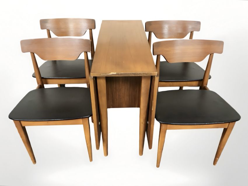 A 20th century teak drop leaf dining table, width 80 cm and four laminated wood and black vinyl chairs