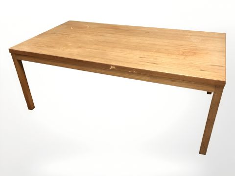 A Danish teak rectangular coffee table, length 137 cm, and two pine tables.