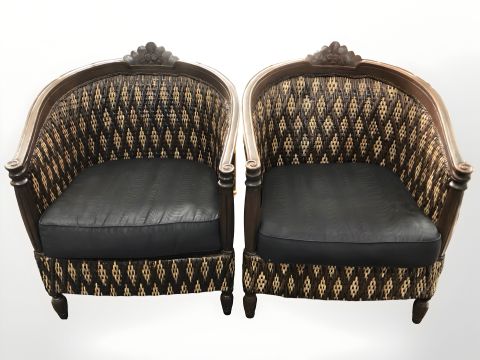 A pair of wooden framed wicker armchairs