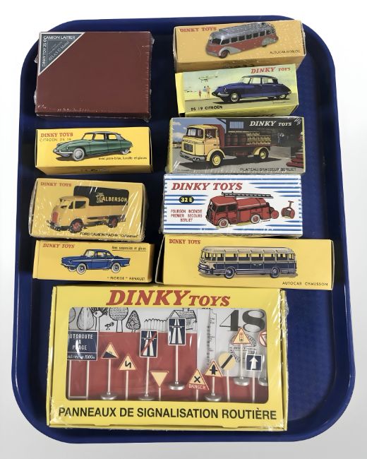 A group of Dinky Atlas Editions diecast model vehicles, all boxed, some sealed in cellophane.
