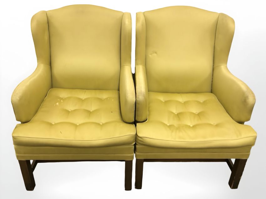 A pair of mid 20th century continental wing back armchairs in olive button fabric, each 64 cm wide