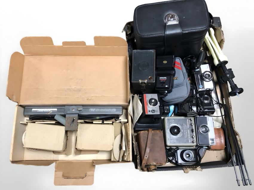 A group of vintage and modern cameras, including Kodak, Brownie, a Smith-Victor Barlight model L-50 in original box, etc. (1 box)