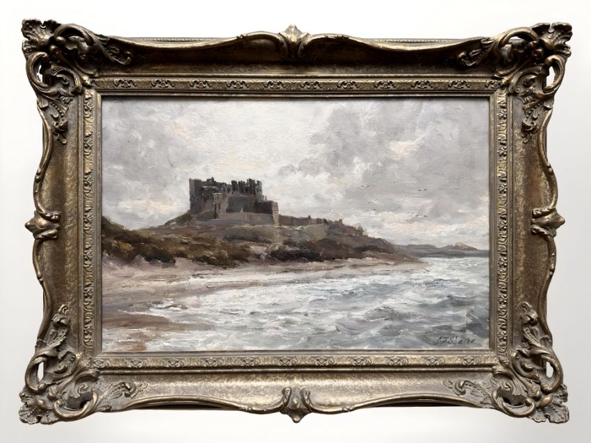 John Falconar Slater (British, 1857-1937) : Bamburgh Castle, oil on canvas, signed, 30 cm x 45 cm, framed.