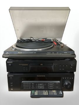A Technics automatic turntable SL-QD33, Sony compact disc player CDP-XE270 and Sony stereo FM-AM receiver STRDE-185. (continental plugs)