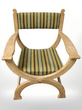 A Danish blond oak X-framed armchair in striped fabric, width 65 cm