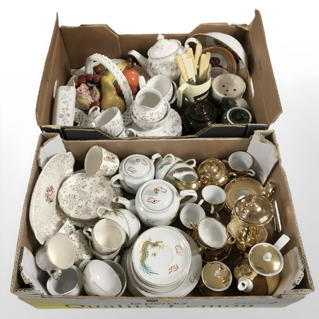 An English porcelain floral decorated part tea set, Japanese export tea china, gold plated tea china, various other ceramics, cutlery. (2 boxes)