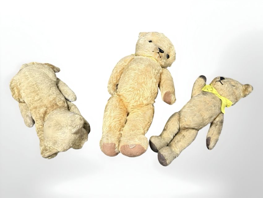 Two vintage jointed mohair teddybears and a further dog, largest 41 cm long.