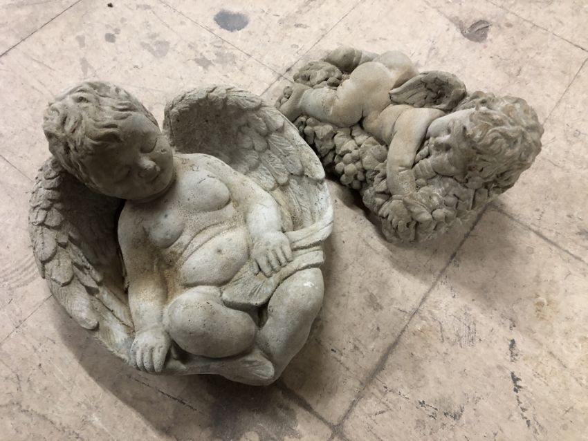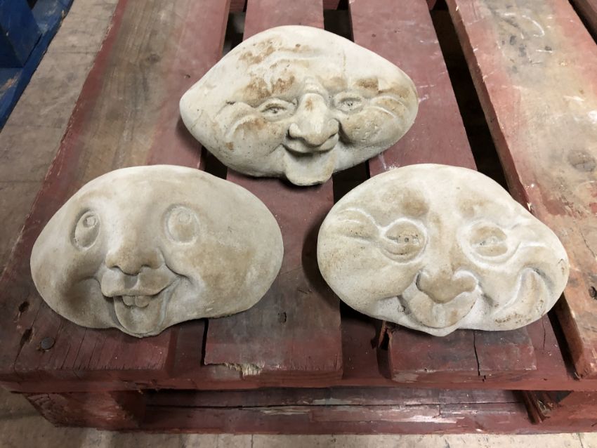 A group of garden ornaments - cherub, cherub's face, lady's face, Lion mask, happy faces, sleeping cherub.