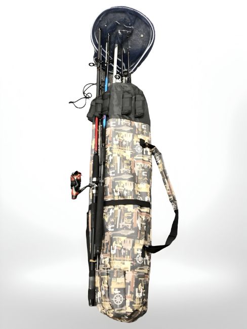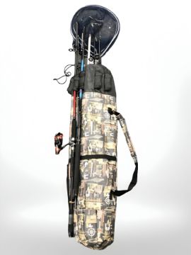 A fishing rod bag containing landing net, collapsible parasol, a Shakespeare Firebird 10ft spin rod and a Coike Heimdall Spin 240 rod.