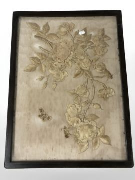 A 19th century silk work picture depicting a butterfly and rose blossom, 59 cm x 43 cm.