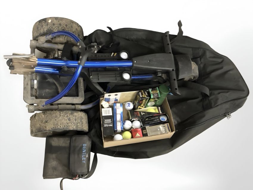 An electric golf bag trolley, with battery pack, carry bag small box of golf balls and tees