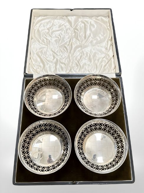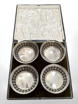 A cased set of four silver pierced bon bon dishes, Walker & Hall, Sheffield 1921, 280.1g.