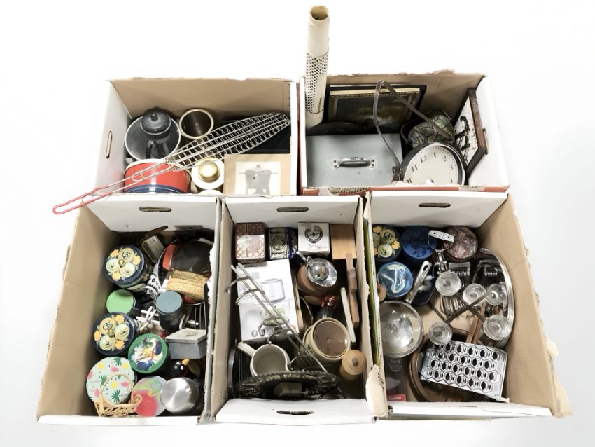 A large quantity of Scandinavian homewares, tins, kitchen items, framed pictures, etc. (5 boxes)