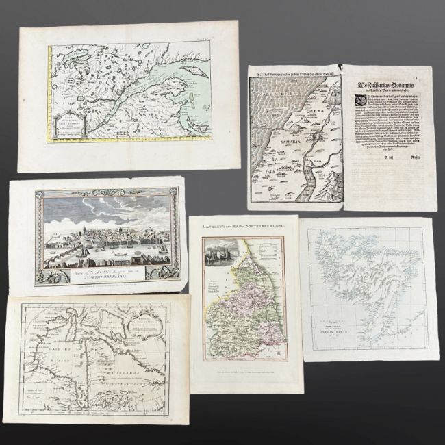 An interesting collection of six maps dating from the 16th century and onwards, some hand coloured examples, a View of Newcastle upon Tyne, Northumberland, Jerusalem & Galilea, Newfoundland etc. (6)