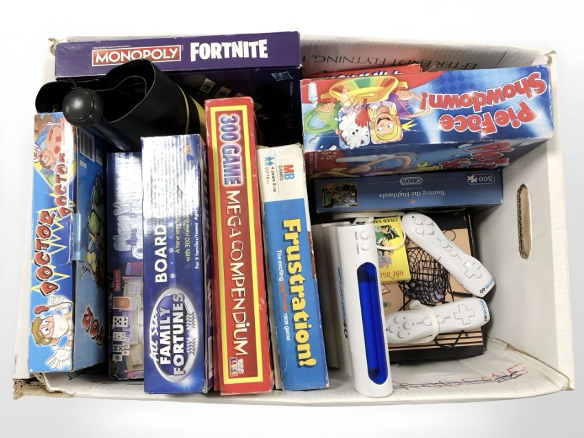 A quantity of board games, Zone40 wireless gaming console, playing cards, etc. (1 box)