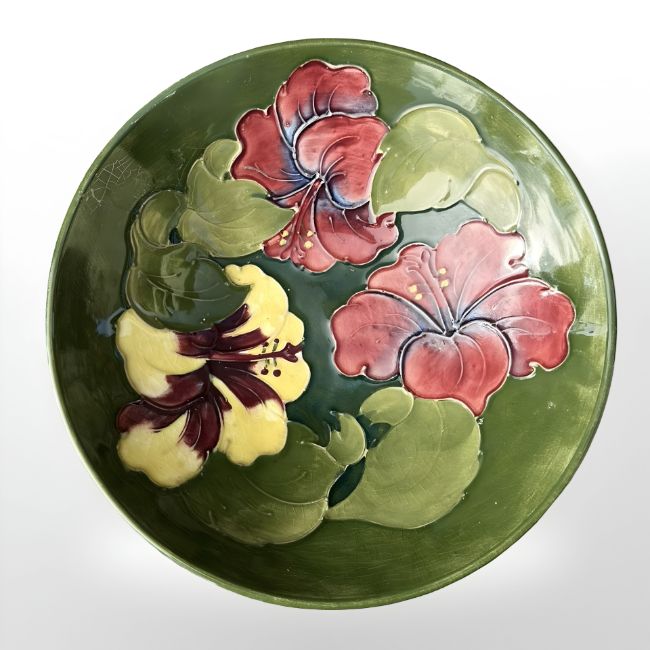 A Moorcroft Hibiscus bowl on green ground, diameter 18 cm.