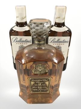 A bottle of Hiram Walker Canadian club classic twelve year old blended whisky, 1L, together with two bottles of Ballantine's finest scotch whisky, 70cl.