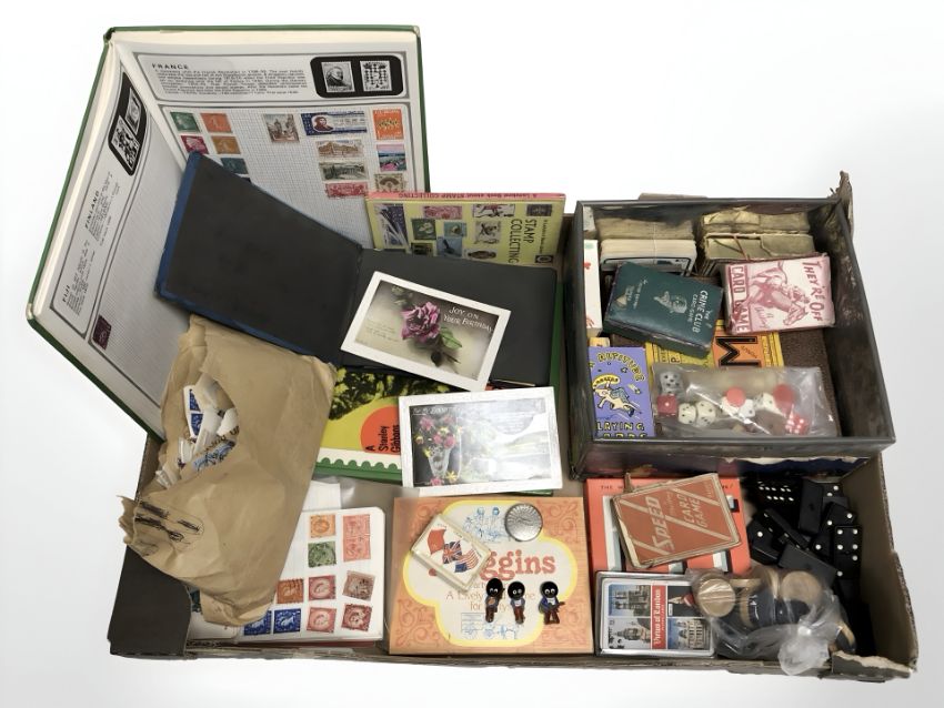 A stamp album and further loose world stamps, Robertsons enameled lapel pins, sets of vintage playing cards, dominoes, draughts, etc. (1 box) Notice from the the-saleroom.com: These items are listed on the basis they are illustrative of a bygone culture in which there were different social norms. We understand the potential controversy surrounding this type of item but believe that providing transparent information about historical context fosters greater understanding of our complex cultural history.