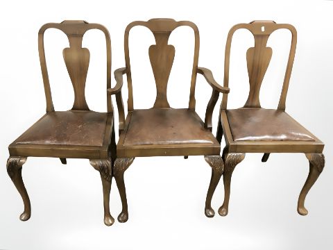 A 20th century carved walnut extending dining table with leaf, overall 205 cm x 95 cm x 75 cm, together with a set of eight matching dining chairs.