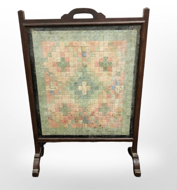 A mahogany fire screen with applied stamp collage to front and back, height 84 cm.