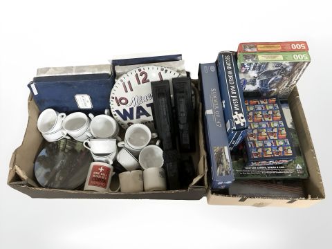 A group of jigsaws, collectors plates depicting railway locomotives, Virgin trains teacups, model coal locomotives on plinths, etc. (2 boxes)